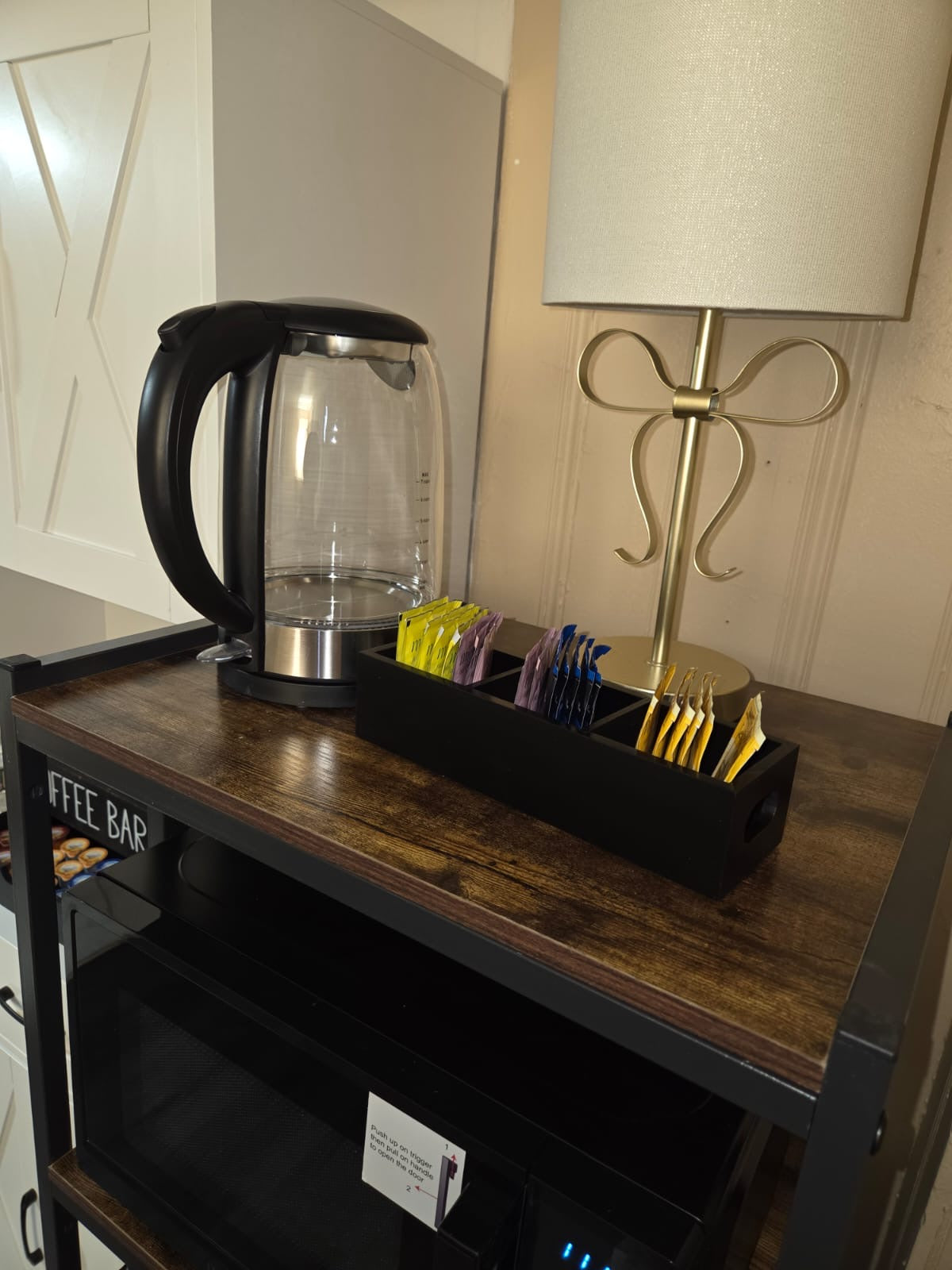 - Coffee and Tea Bar with ( Hot water kettle, coffee maker, Coffee Creamer, tea bags, Coffee)